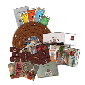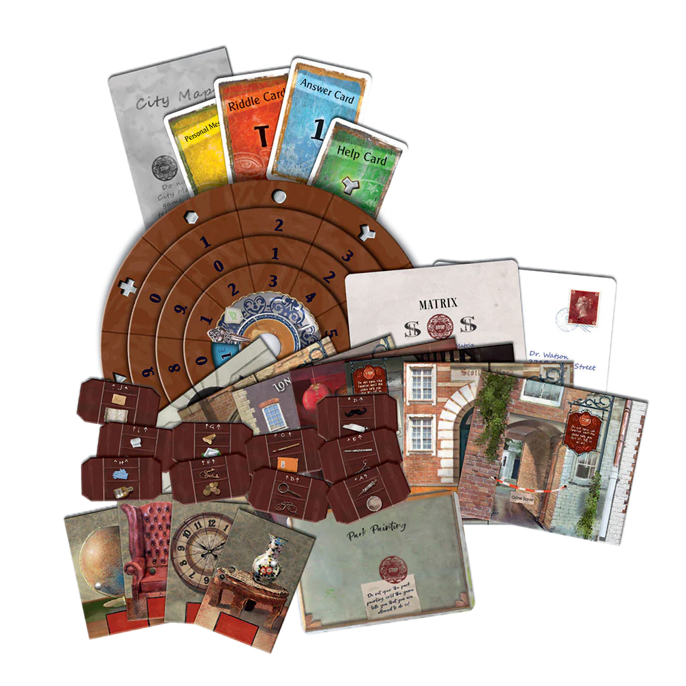 Contains:  88 cards, 1 decoder disk, 19 strange items, 17 locations sheets, 1 letter, 1 matrix, 1 city map, 1 park painting, and 1 rulebook.