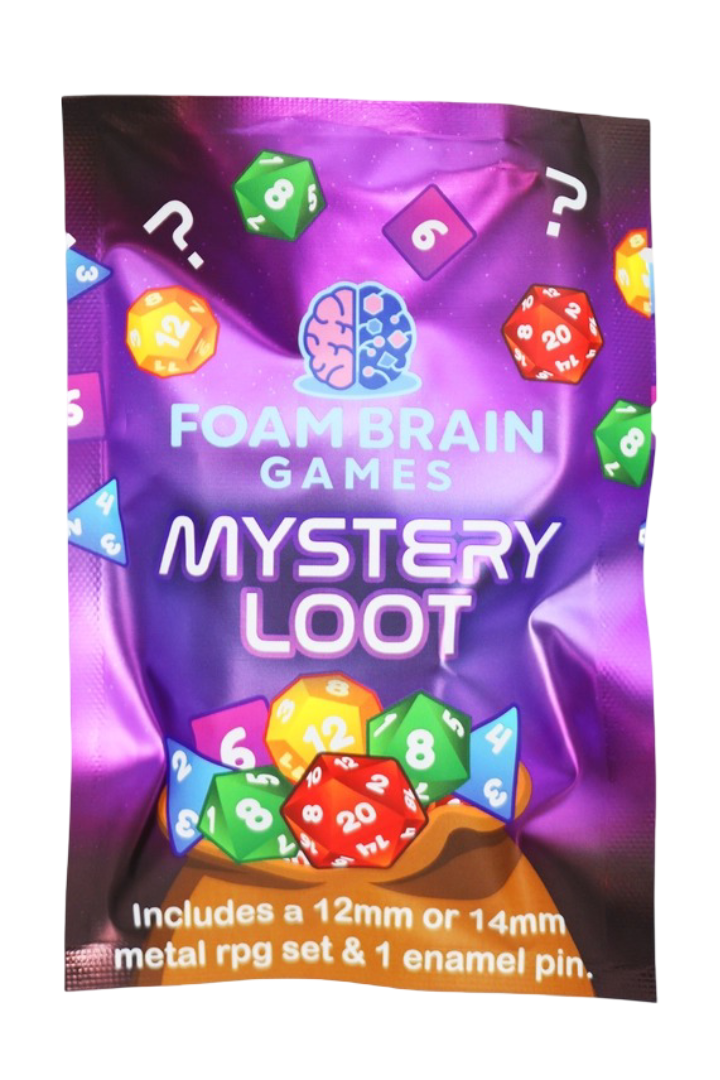 Contains: (1) 12mm Metal RPG Set (matching set) and 1 Random Enamel Pin, in a sealed mystery package!
