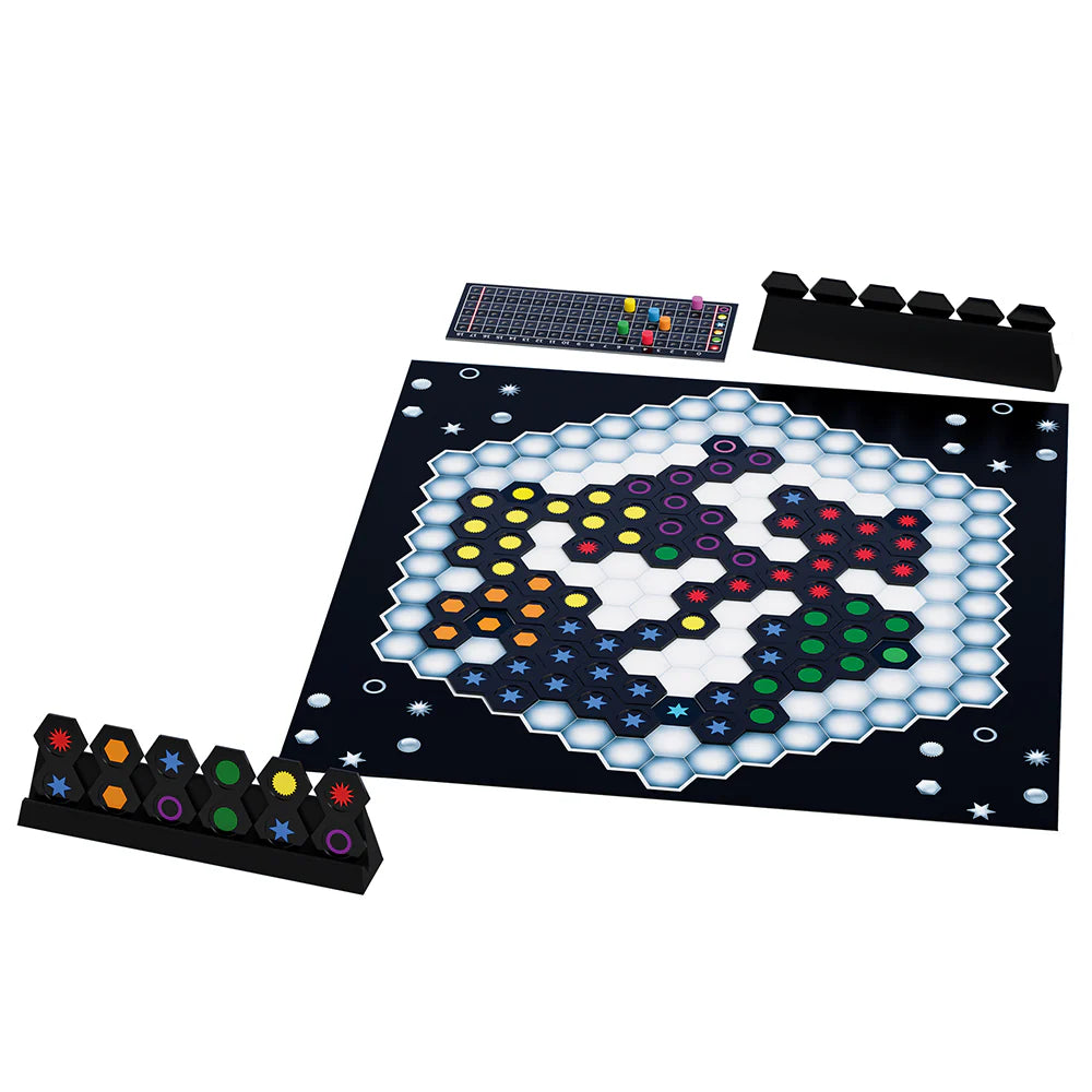 In Ingenious, one to four players take turns placing colored tiles on the game board, earning points for the number of matching colored symbols that radiate outward in straight lines from the placed tile.