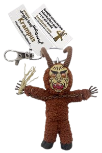 The Krampus is an imaginary Christmas character that dates back to the 12th century in Germany and other Alpine countries in Europe. He is traditionally a devil-type figure with cloven hooves instead of feet, and long horns atop his head, along with fangs and a forked long tongue.