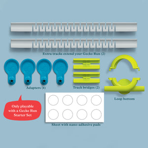 The Loop Expansion Pack comes with over a dozen pieces to complement the Gecko Run Starter Set, including a loop stunt; additional marbles and nano-adhesive pads; 2 extra tracks; and more.