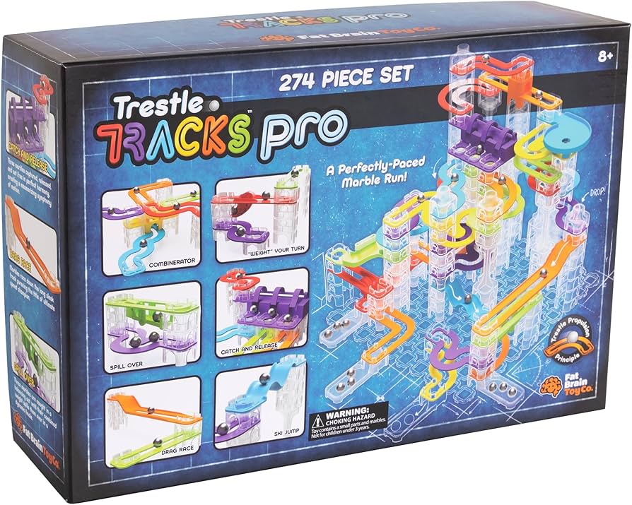 Contains: 26 basic tracks, whirlpool track, stairs track, bouncer track, plinko track, switcher track, 200 risers, 4 catchers, 4 toppers, 20 steel balls, 4 bases, catch-and-release track, combiner track, ski jump track, wait-your-turn track, fill-and-spill track, 5 tall risers, long-run track, and guide.