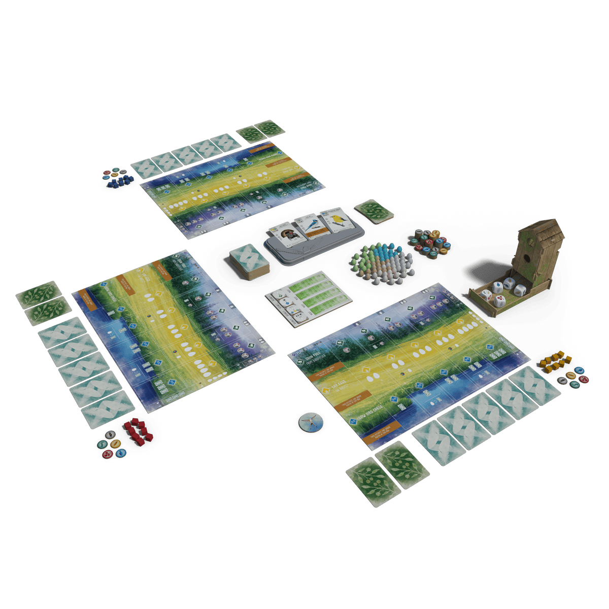 Contents: 1 Rulebook, 1 Appendix, 1 Automa Rulebook, 1 Goal Board, 1 Bird Tray, 5 Player Mats, 1 Birdfeeder Dice Tower, 1 Scorepad, 170 Bird Cards, 26 Bonus Cards, 16 Automa Cards, 75 Egg Miniatures, 5 Wooden Dice, 40 Wooden Action Cubes, 103 Food Tokens, 8 Goal Tiles, 1 Swift-start Pack.