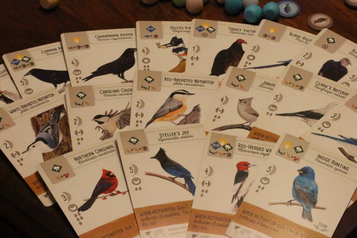 You are bird enthusiasts - researchers, bird watchers, ornithologists, and collectors - seeking to discover and attract the best birds to your aviary. Each bird extends a chain of powerful combinations in one of your habitats (actions). These habitats focus on several key aspects of growth - Gain food tokens via custom dice in a birdfeeder dice tower, Lay eggs using egg miniatures in a variety of colors, and Draw from hundreds of unique bird cards and play them.