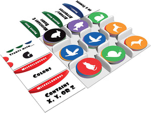 Contains: 110 category cards, 54 dry erase discs (9 in each color), 6 dry erase markers, 1 insert, and rulebook.