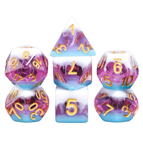 Contains: standard 16mm size 7 piece polyhedral dice set in a protective, clear plastic bag.
