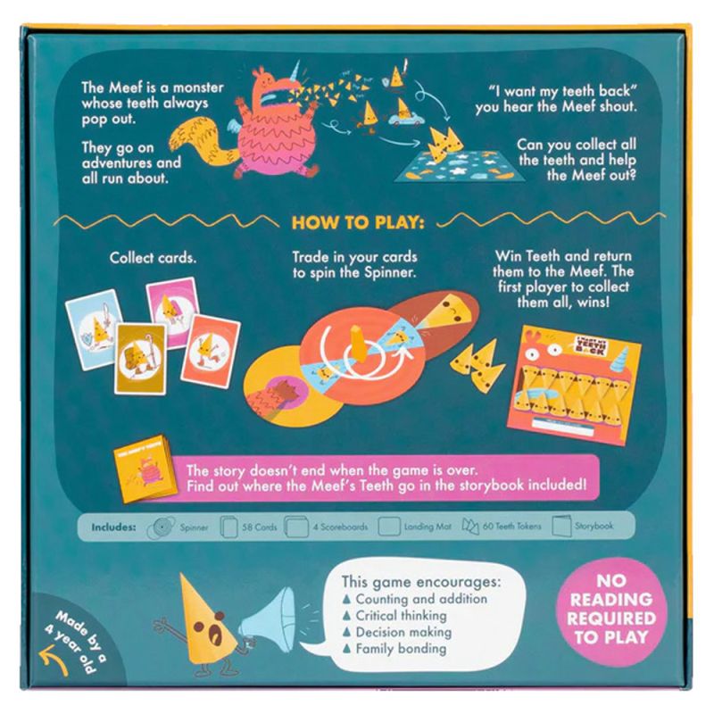 Contents: 1 Spinner, 1 Landing Mat, 4 Meefs, 57 Cards, 1 Menu Card, 60 Teeth Tokens.
